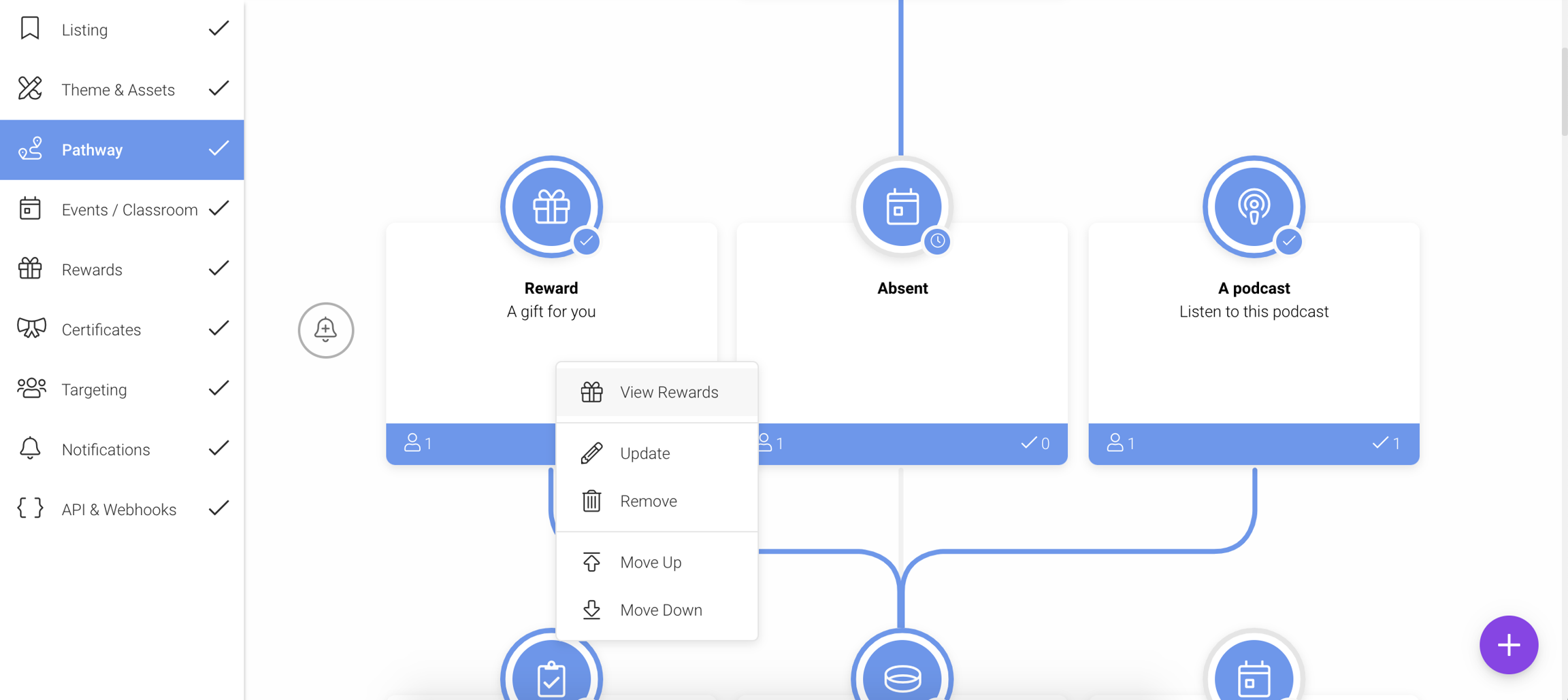 Assign a Reward. Assign the reward that will be given when users reach this point in the Pathway. Go to Rewards to create a new reward.
