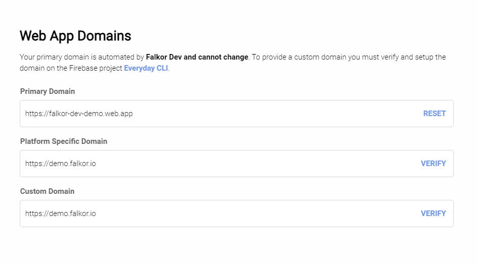 Primary Domain: This is automatically provided by Firebase and takes the form of platform-appname.web.app (e.g. bytekast-demo.web.app)
